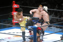 タイチには船木と佐野がダブルのミドルキック(左写真)。