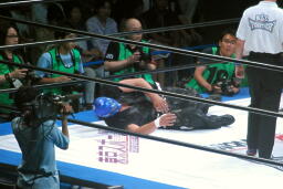 ヒデオ・サイトーは青義マシンマスクで入場(左写真)。
