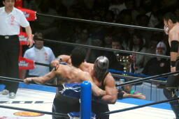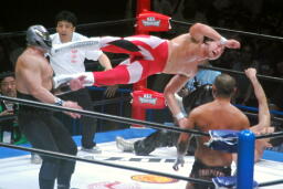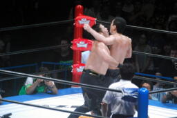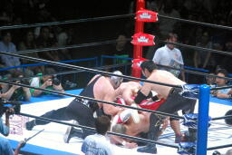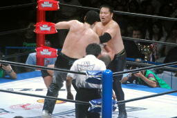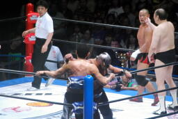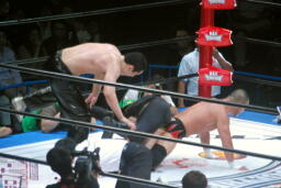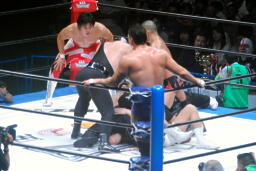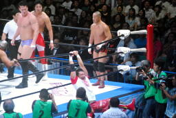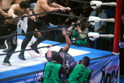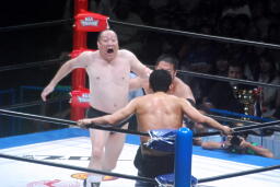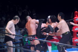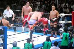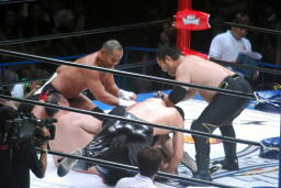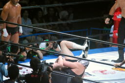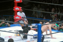 外道が雅央に外道クラッチ(左写真)、カウント3。雅央退場。