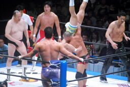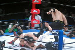 残り10人。本間がコケシ投下(左写真)、しかしかわされフォールされて退場。