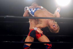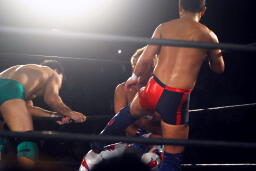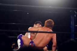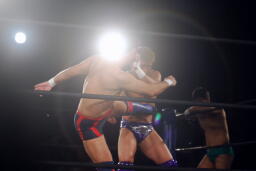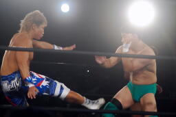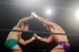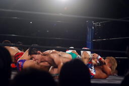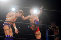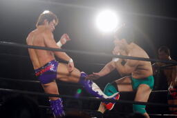 先発は稔と臼田。キックの打ち合い(右写真)。稔が日高にタッチ。ローキックの打ち合い、臼田キャッチして山本にタッチ。