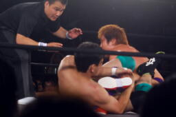 山本切り返してアキレス腱固め(左写真)、稔ロープ。場外まで逃げる。ケニー中村(アーバン・ケン)レフェリーは「場外ダウン」を取る。