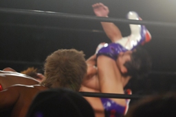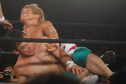 稔臼田にヒザ十字、日高も山本にショーンキャプチャー(右写真)。臼田がロープ。15分経過。