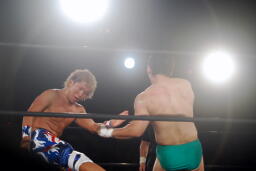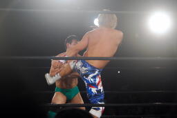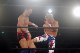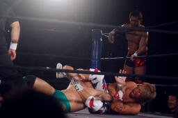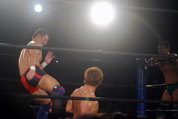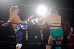 日高ソバット(右写真)、ダウン。カウント7で立つ。日高ハイキック、臼田ダウン。稔にタッチ。