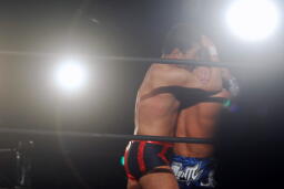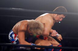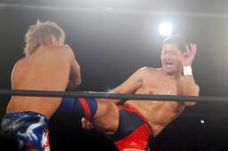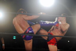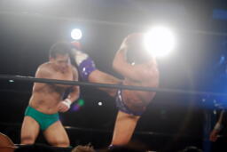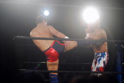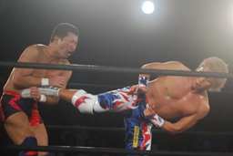 山本パンチ、バックブロー、稔ダウン、カウント9。山本フロントネックロック、稔ロープ。稔ハイキック(右写真)、ミサイルキック、バズソーキック、山本ダウン、カウント9。