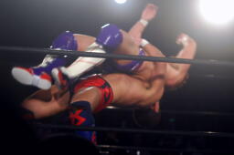 山本ヒザ十字、稔アキレス腱固めに切り返す、臼田がカット。山本クロスヒールホールド(左写真)、日高がカット。稔ニードロップ、日高にタッチ。5分経過。
