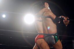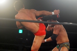 スルガのパンチをかわして澤ハーフネルソンスープレックス(左写真)。