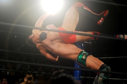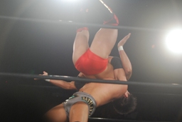 スルガキック、足取ってアキレス腱固め、澤切り返すがスルガはヒールホールドに、澤ロープ。スルガ足取って逆片エビ(右写真)。