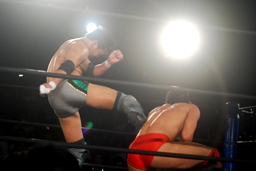 スルガヒザ蹴り連打、胸板にキック、澤バックドロップ(左写真)。