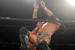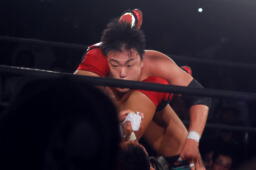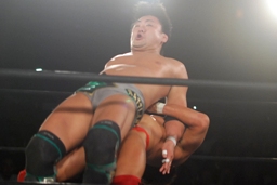 スルガ十字に、澤なんとか上体を起こして難を逃れる(左写真)。スルガアームストレッチからケサ固め、澤ロープ。