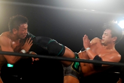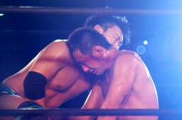 スルガダブルアームスープレックス狙う、澤ブロック(右写真)。