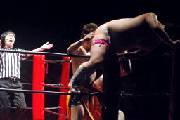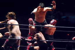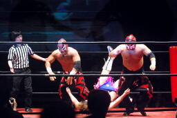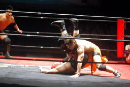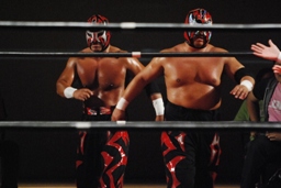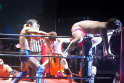 岸和田ズは石川修司をダブルのフラップジャックで諸橋の上に落とし(右写真)上から2人まとめて押さえつけて3カウント。石川&諸橋組退場。10分経過。