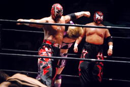 高梨にチョップ(右写真)、高梨をディーノの尻に突っ込ませる。