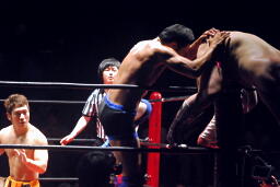 ふらふらとコーナーに下がった高梨の肩に6号がコーナーから飛び移り(右写真)、