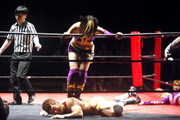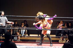 冨宅が美央にアンクルホールド(左写真)、美央ギブアップ。さくら&美央退場。
