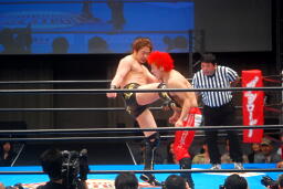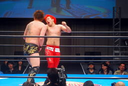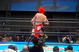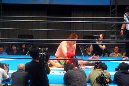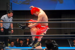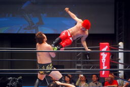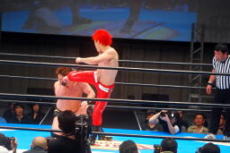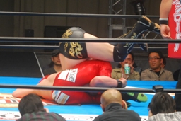 胸板にキック(右写真)、カウント2。