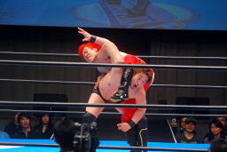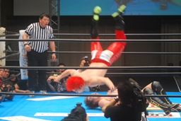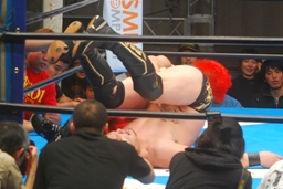 自演乙エプロンに出るとスワンダイブミサイルキック(左写真)、カウント2。