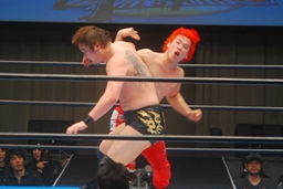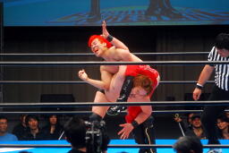 佐藤は自演乙のハイキックをキャッチしてキャプチュード(左写真)。
