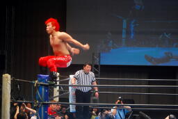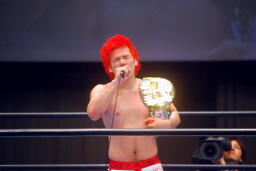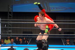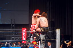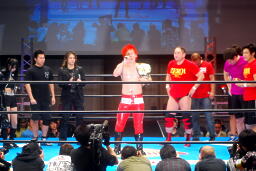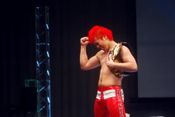 自演乙「すいません、デビュー戦なのにマイクまでやらせてもらって。中学生の頃、猪木さんの引退試合を見て、それがきっかけで格闘技やるようになりました。ブシロードさんがプロレス大会を行うということで、自分も夢を叶えたいと、ちっちゃい頃からの夢を叶えさせて欲しいと、こんな素晴らしい大会、素晴らしい選手が集まるところでデビューさせてもらいました。」(左写真)