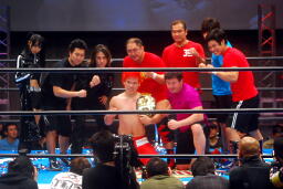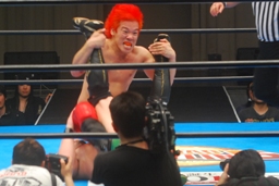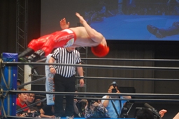 「プロレス界には今日闘った、僕以外の素晴らしい選手がいますんで、皆さんぜひ見に来てください!ブシロードレスリング最高です!今日はありがとうございました!」(右写真)