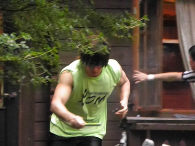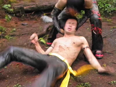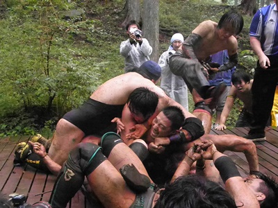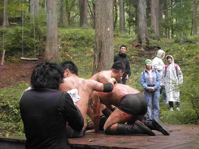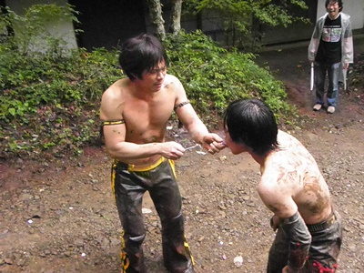 澤が佐藤を池に落とそうとする、マイケルが押さえる(右写真)。