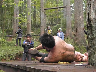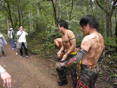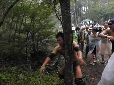 HARASHIMAと高木が発射されたパラシュートを取ろうとするが木に引っ掛かった模様(左写真)。