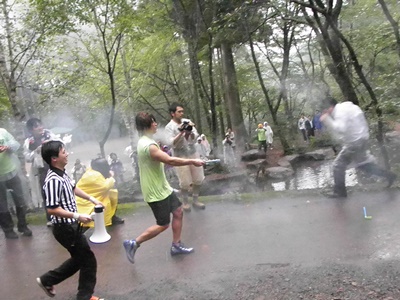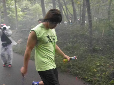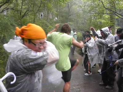 PKがダッシュ(右写真)。ぬかるんで動きの取りにくいはずの道を左肩固定、右手に花火のバランス取りづらいであろう状況で全速力で走るPKからはなかなか逃げられない。ビニール傘では防御は不可能。