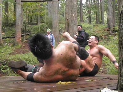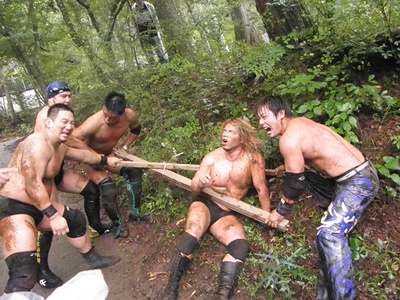 澤が大家を木に固定して側転エルボー狙う(右写真)、