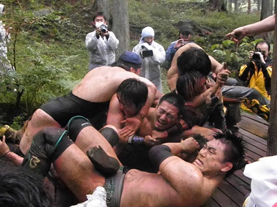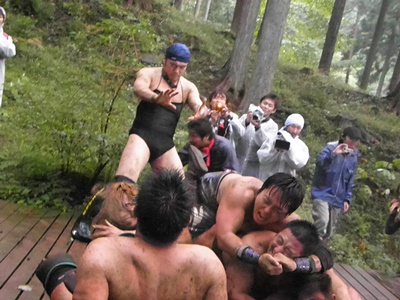 起き上がる大家(左写真)。
