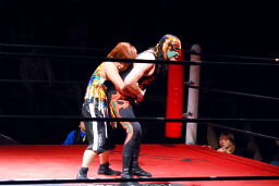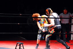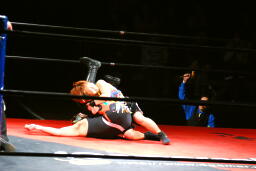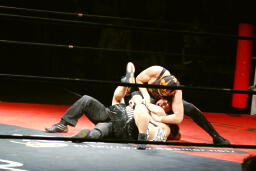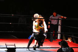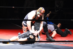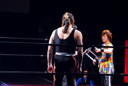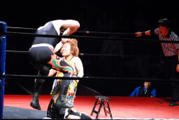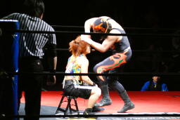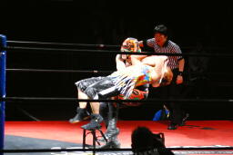 サムライ何を考えたかレフェリーのバーブを巻き込んでチキンウィングアームロックに(右写真)。バーブの反則カウントでブレーク。