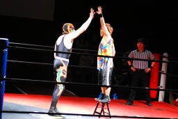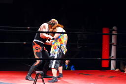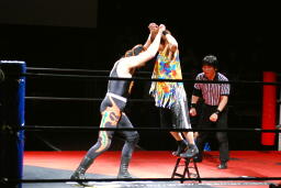 サムライはミニラダーで固定してのチキンウィングアームロック(左写真)、夏樹ギブアップ。