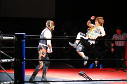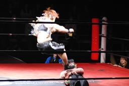 夏樹ソバット(左写真)、ロープに飛ぶ。