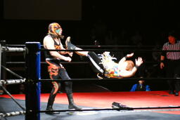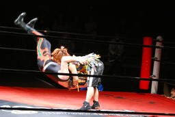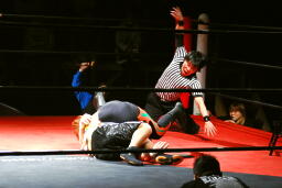 ソバットからボディスラム(左写真)、カウント2。