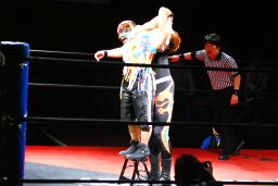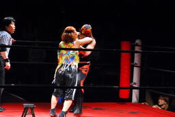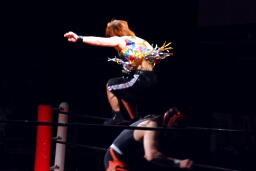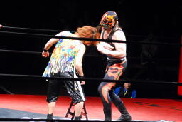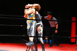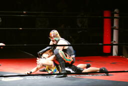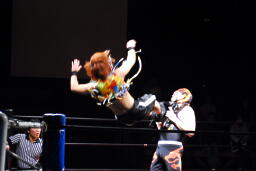 サムライコーナーに上る、夏樹飛びついてアームホイップ(右写真)。