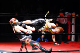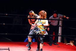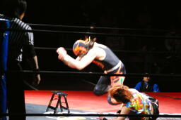 今度は夏樹がサムライをラダーに座らせてエルボー連打、ロープに飛んでドロップキック(左写真)、カウント2。
