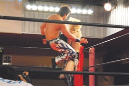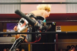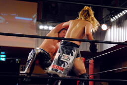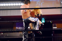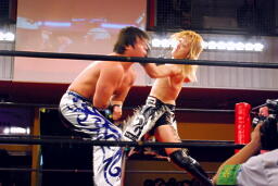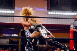 鳥羽さらにパンチを連打、HARASHIMAキャッチ、再度肩に担いで鳥羽の顔面にヒザ(左写真)。