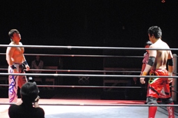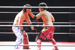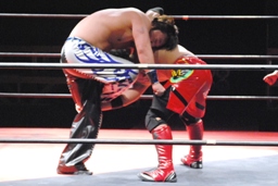 HARASHIMAまたサッカーボールキック(右写真)、安部さらに返しサッカーボールキックを打ち合う。