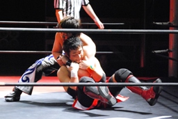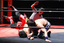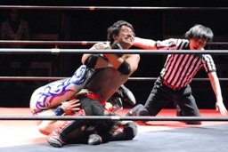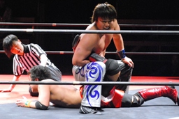 HARASHIMAハーフネルソンから安部の肩を付ける(右写真)、カウント2。