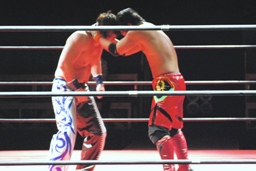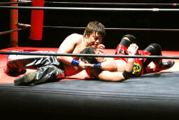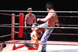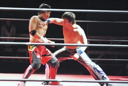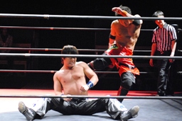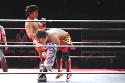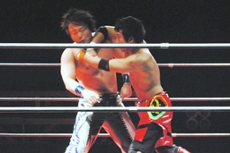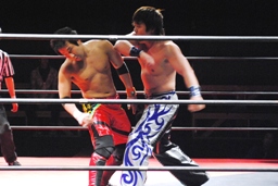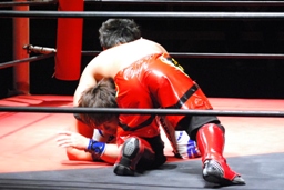 安部バック取る、HARASHIMAブロックしてヒザ蹴り(右写真)。