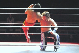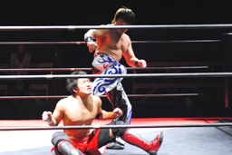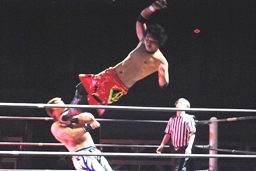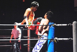 コーナーに上ってミサイルキック(左写真)、カウント2。10分経過。