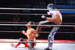 HARASHIMA大鷲の得意技であるランニングノド輪落としからパワーボム(右写真)。