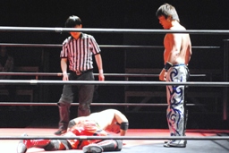 HARASHIMAストンピング、後頭部にギロチンドロップ、カウント2。起きてこない安部を見下ろすHARASHIMA(右写真)。さらにストンピング連打、エルボードロップ。