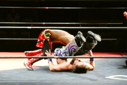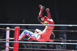 HARASHIMAロープに飛ぶ、安部ウラカン・ラナ(左写真)、カウント2。