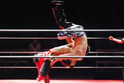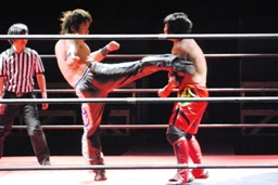 HARASHIMAミドルキック(左写真)、コーナーに振って串刺しビッグブーツ。