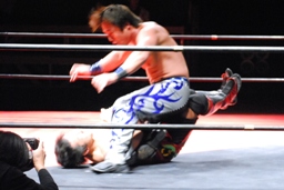 HARASHIMA首投げからまたサッカーボールキック(右写真)、カウント2。キャメルクラッチ、安部ロープ。HARASHIMAストンピング。