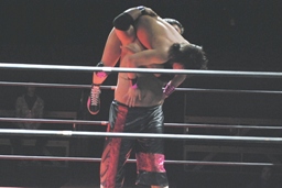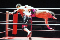 石川逆水平、抱え上げてターンバックルに投げつける(右写真)。
