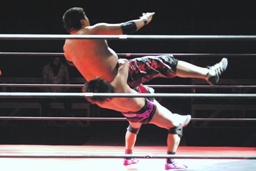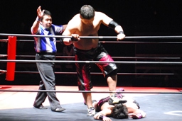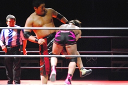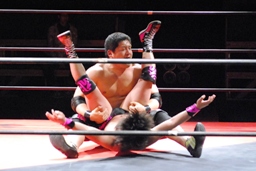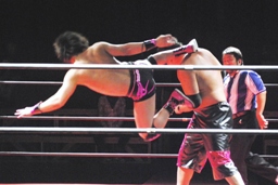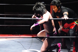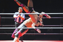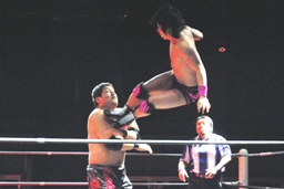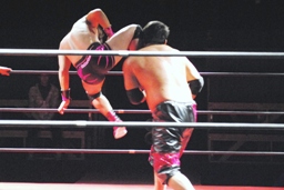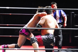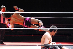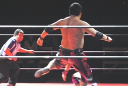 石井ジャンピングニーアタック(右写真)、ソバットからロープに飛んでもう一発ジャンピングニーアタック、コーナーに上ってミサイルキック、カウント2。