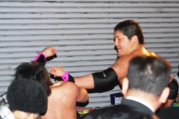石川追いかけてエルボー、逆水平連打(右写真)。場外で踏みつけ、リングに戻す。