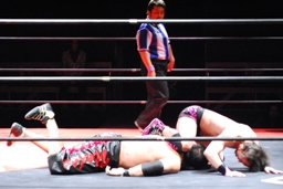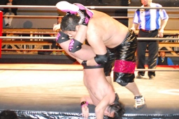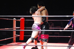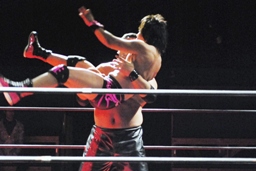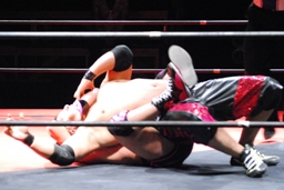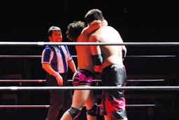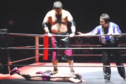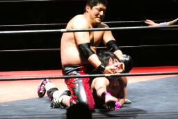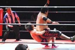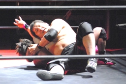 石井ロープに振る、石川切り返す、石井はカニばさみで石川をターンバックルに突っ込ませ、背後から飛びついてスリーパー、後ろに引き倒て絞める(右写真)、石川ロープ。