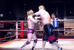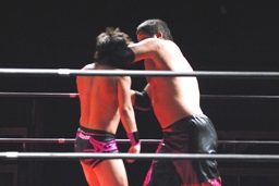エルボーの打ち合いから石川がヘッドバット、しかし石井はヘッドバットを連打で打ち返す(左写真)。この負けず嫌いっぷりが凄い。